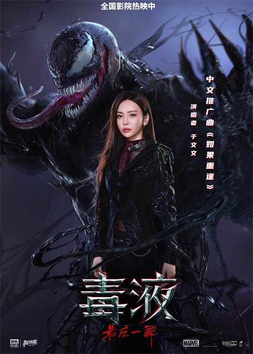 此次发布的中文推广曲《如果重逢》官宣海报中,于文文一袭黑衣,身后的毒液触手充斥画面充满威慑力,充满层次的玄色画面为整体氛围增添了一丝神秘感,非常吸睛。同步发布的MV中,伴随着毒液埃迪勇闯死劫漩涡,对抗外星异兽上演毁灭之战的画面,于文文以低沉烟嗓为观众带来肃杀之感,而副歌则尽显爆发力,直击内心。