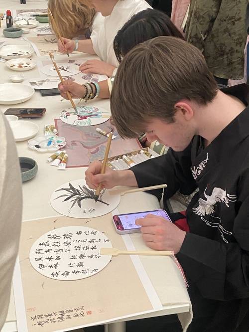 临摹体验区成为这次活动最鲜活的跨文化现场。耶鲁学子在团扇上勾勒临摹青绿山水,颜料与绢帛相遇的瞬间,央美师生穿梭指导的身影,与百年前央美前辈在战火中临摹德国版画的场景形成奇妙呼应——技艺传承的密码,正在跨国界的笔触交叠中焕发新生。