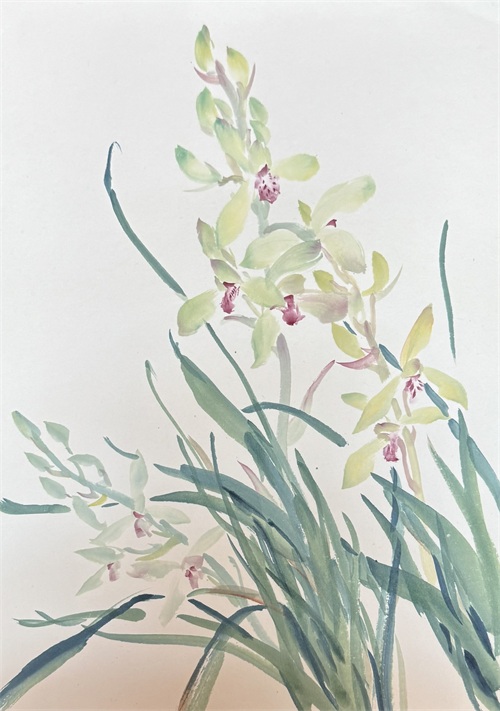 马楚航以 “藤黄 + 花青” 调和传统绿色,遵循 “先画捧瓣定中心” 的结构逻辑,搭配偏蓝花串与偏黄花苞形成色彩呼应,包片以淡色表现轻薄感。画叶时打破 “细瘦刻板印象”,用 “破缝眼” 传统礼法调整线条,逆风运笔与缓节奏画花形成对比,既显兰花清雅,又体现 “落笔无悔、观察先行” 的创作原则。