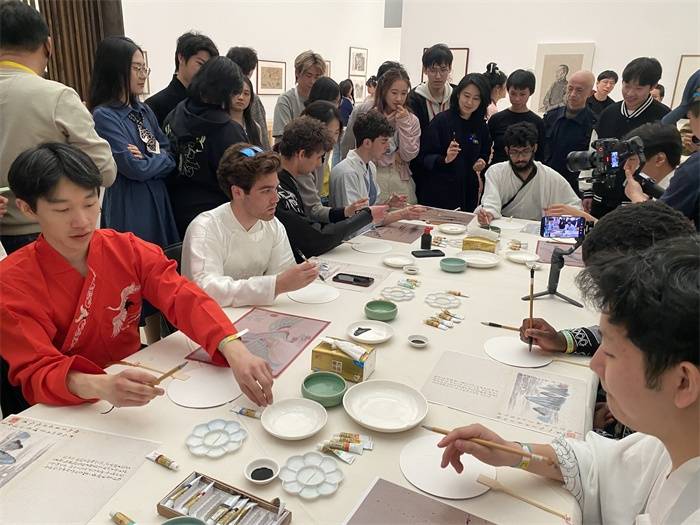 临摹体验区成为这次活动最鲜活的跨文化现场。耶鲁学子在团扇上勾勒临摹青绿山水,颜料与绢帛相遇的瞬间,央美师生穿梭指导的身影,与百年前央美前辈在战火中临摹德国版画的场景形成奇妙呼应——技艺传承的密码,正在跨国界的笔触交叠中焕发新生。