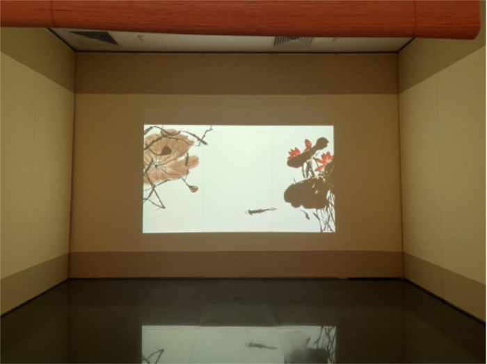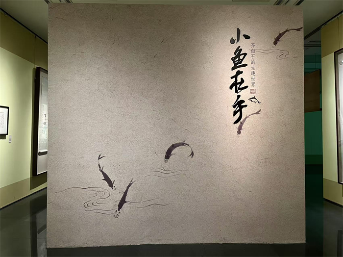 在这场展览中,一段1分30秒的动画短片在展厅悄然流转:银灰色小鱼摆尾跃出瓷白鱼缸,化作水墨线条融入青碧荷塘,透明虾须拂过摇曳水草,蝌蚪甩动长尾逆着溪流摆成“人”字,这是策展团队以齐白石画作为蓝本,耗时三个月手绘600余张原稿、结合数字技术的再创作——仅3秒的小鱼摆尾镜头,就临摹了《游动的鱼》中27种尾鳍动态,力求让每帧画面都藏着原画的笔墨筋骨。动画让齐白石笔下的花鸟鱼虫真正“活”了起来,观众可以从这些颤动的触须、摆尾的弧度里,感受到他观察生命时那份孩童般的好奇。这段灵动的动画,恰似展览主题“小鱼在乎”的注脚,让百年前的水墨意趣,在数字光影中与当代观众的目光温柔相接。