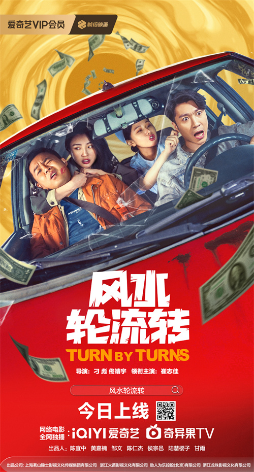 由上海茗山隐士影视文化传媒集团有限公司、浙江火苗影视文化有限公司、助人为乐控股(北京)有限公司、浙江龙珠影视文化有限公司出品,苏州三益文化传媒有限公司、浙江金海派文化发展有限公司联合出品的荒诞喜剧电影《风水轮流转》将于6月7日在爱奇艺电影频道独家上线!